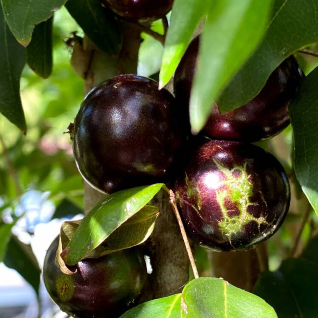 The Crowned Jaboticaba, also known as Plinia Coronata, is a stunning, uncommon, and dark-colored jaboticaba belonging to the Myrtaceae family. It is one of the most distinctive and has a flavour profile similar to Sabara jaboticaba with a tinge of floral bubblegum or even root beer if plucked at an extremely ripe stage. These are a delightful departure from the other, more popular jaboticabas, which tend to taste more identical to one another, and are best eaten straight from the bowl after being newly picked. Beautiful and radically varying in size, the prominent crown at the sepal is a genuine feather in mother nature’s crown. If regularly irrigated and fertilised, 60%+ pulp by weight bears a few times per year after 2–5 years of fruiting.