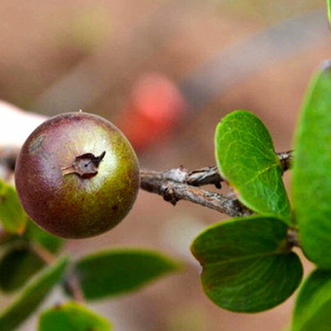 The unusual Dwarf Jaboticaba/Plinia Nana tree has a sinuous trunk, few branches, and thick, prickly bark. It has shiny, smooth, lance-shaped leaves. The most notable characteristic of this plant, which grows beneath bigger trees, is that its globular berries appear to grow attached to the main stem and thicker branches.