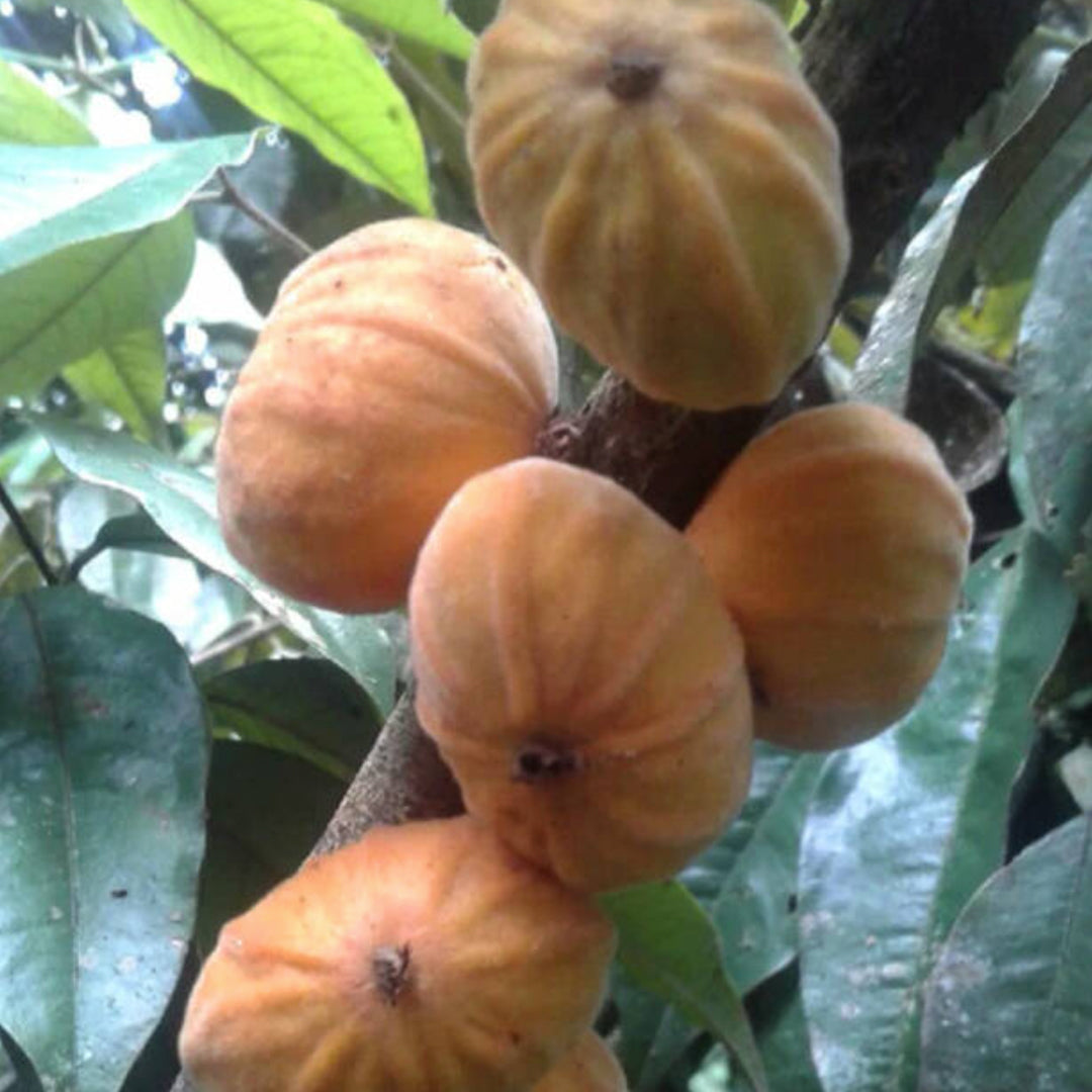 The Myrtaceae family includes dwarf mulchi, which is indigenous to Costa Rica and Panama in the southernmost point of North America. The tree grows slowly but blooms very early—at just 4–5 years old—and if left unpruned, adopts the shape of a tiny shrub. The tree produces 3 centimetre yellow fruits with a thin layer of flesh within that are slightly peppery and tasty. Similar to the jaboticaba, fruits often develop directly from the trunk or main branches and exhibit longitudinal ridging. After several years of production, the tree might produce multiple times year. The Plinia inflata and Plinia edulis leaves are comparable.