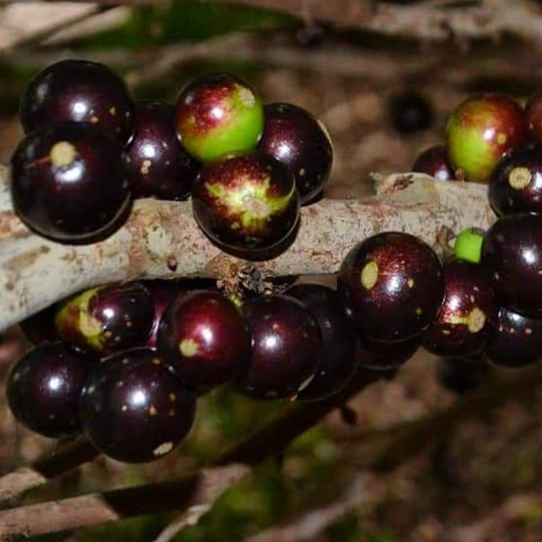 Jabuticaba rajada de Tatu is a tiny, semi-deciduous tree that can reach heights of 4 to 12 metres. It has a dense, elongated crown. It is a stunning and extremely fruitful variety of jaboticaba. Fruits are typically consumed raw or preserved in jams and jellies. The translucent white pulp is extremely delicious and juicy. The little, cracked, black fruits with two to three seeds