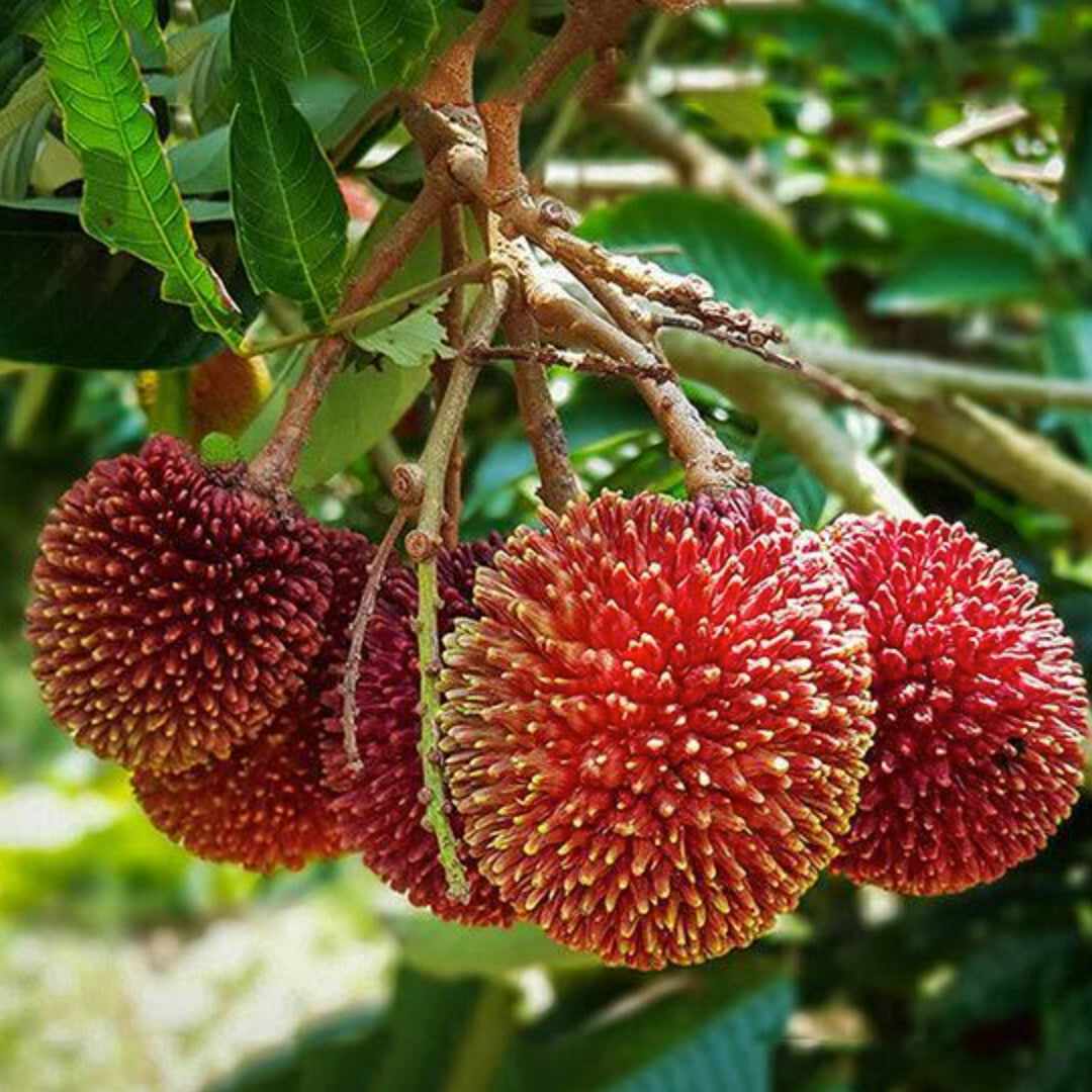 The fruit is ovoid, dark crimson, and covered in stiff, leathery spines or thick, fleshy tubercles that have blunt tips. One or two tiny, immature fruits could be found nestling next to the stem. The seed coat, which separates from the shining, thick, white or yellowish-white meat inside, is a thin, grayish-brown colour. Generally speaking, the flavour is more sweeter than the rambutan’s. The seed is light brown, ovoid, oblong, or ellipsoid, and it has a slight flattening on one side.