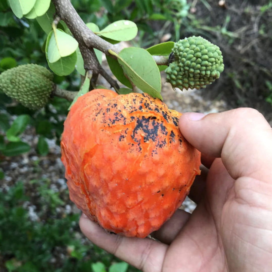 Red Cherimoya/Orange Annona is a rare, small, prickly, furry tree or shrub that is native to Brazil. It has yellowish green flowers, pale green foliage, and vivid orange fruits with orange flesh that are about the size of apples. It grows better in drier tropical settings for cultivation.