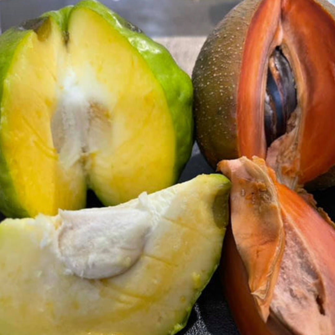 The fruit is round to ovoid in shape, with flesh that is reddish pink, luscious, and creamy and has a flavour all its own that is reminiscent of Mamey sapote.