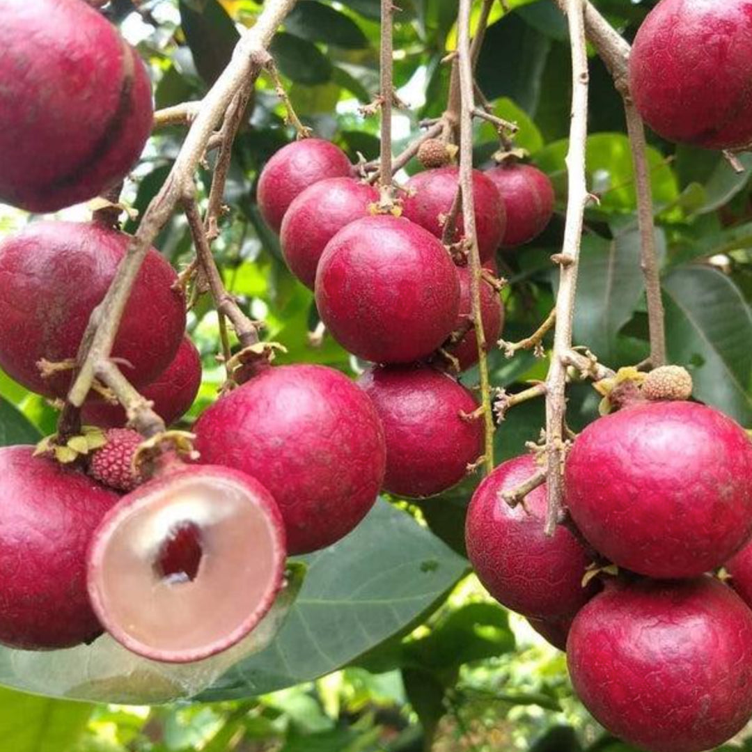 One of the most attractive varieties of evergreen longans is ruby longan. Due to the Ruby red hue of the fruits and leaves, this cultivar earned its name. In its completely filled state, it is really striking. It is a type of tropical tree that bears eatable fruit. It is one of the most well-known tropical members of the Sapindaceae soapberry family, which also includes the lychee and rambutan. The longan’s fruit is comparable to the lychee’s, Pin. It is among the most significant tropical and subtropical fruits worldwide. Fruits are incredibly delicious and juicy. The longan fruit is prized among fruits for its excellent nutritional and medicinal qualities. The longan fruit has a high natural sugar content, is quite juicy, and is therefore very sweet. The translucent flesh has a grape-like firmness and a lichee-like flavour.