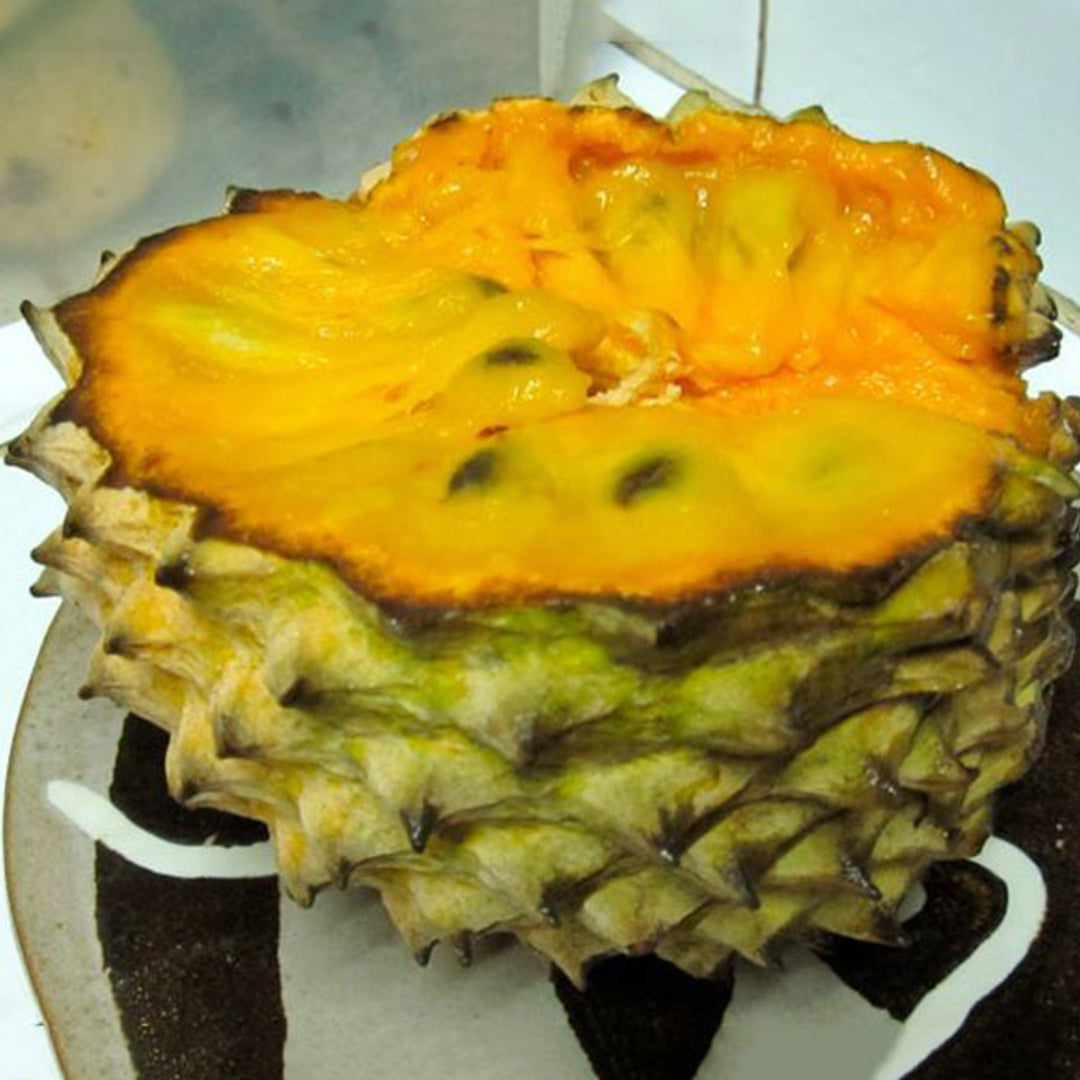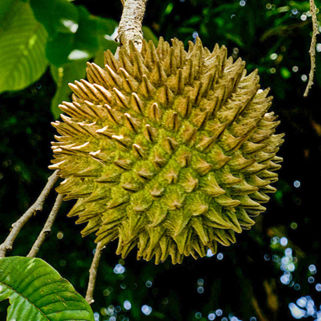When ripe, the fruit has a felt-like brown skin that is spherical, broad, and difficult to break open. The fruit’s exterior bears protrusion that resemble hooks. It contains several seeds, whose germination times range from one to six months. Trees can be planted in containers and require one to three years to bear fruit. The cherimoya, the sugar apple, and other Annona species are all closely related to this species. The fruit of the soncoya, one of the Annonas, is of mediocre quality and has not attracted widespread cultivation. Some people may characterise the fruit’s texture as stringy or fibrous; it is similar to that of a soursop.