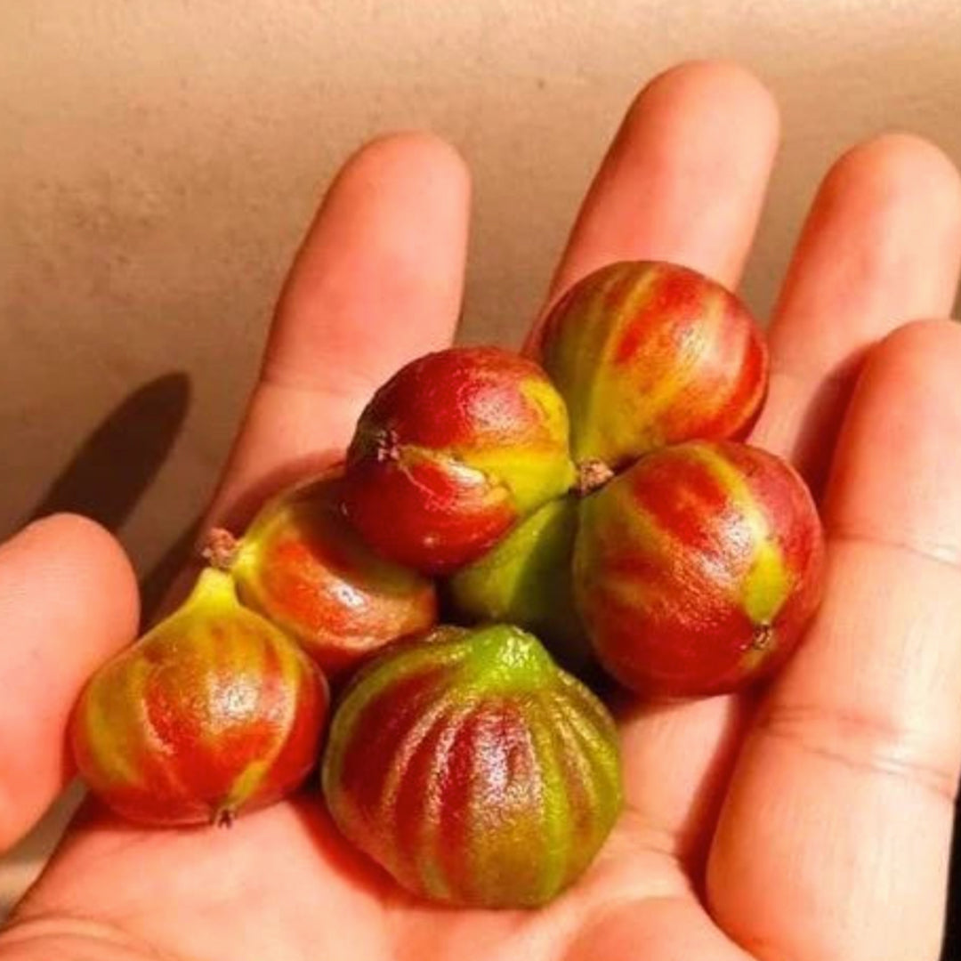 The globose fruit has five to twenty light green or golden costate ribs, which may completely disappear in fully mature fruit. These ribs get smaller as the fruit ripens. The costate ribs, which are typically light green long after they cease projecting and form a spectacular contrast of brilliant green streaks over otherwise scarlet fruit, are the cultivar’s most distinguishing feature. On the fruit’s apex, there are frequently little sepal fragments visible, however these can be easily removed or eaten together with the fruit. The fruit’s attachment to the peduncle can range from a little nipple to a visibly protruding rostrate point as it matures in clusters of up to 6 fruits. Its pulp is juicy and tasty.